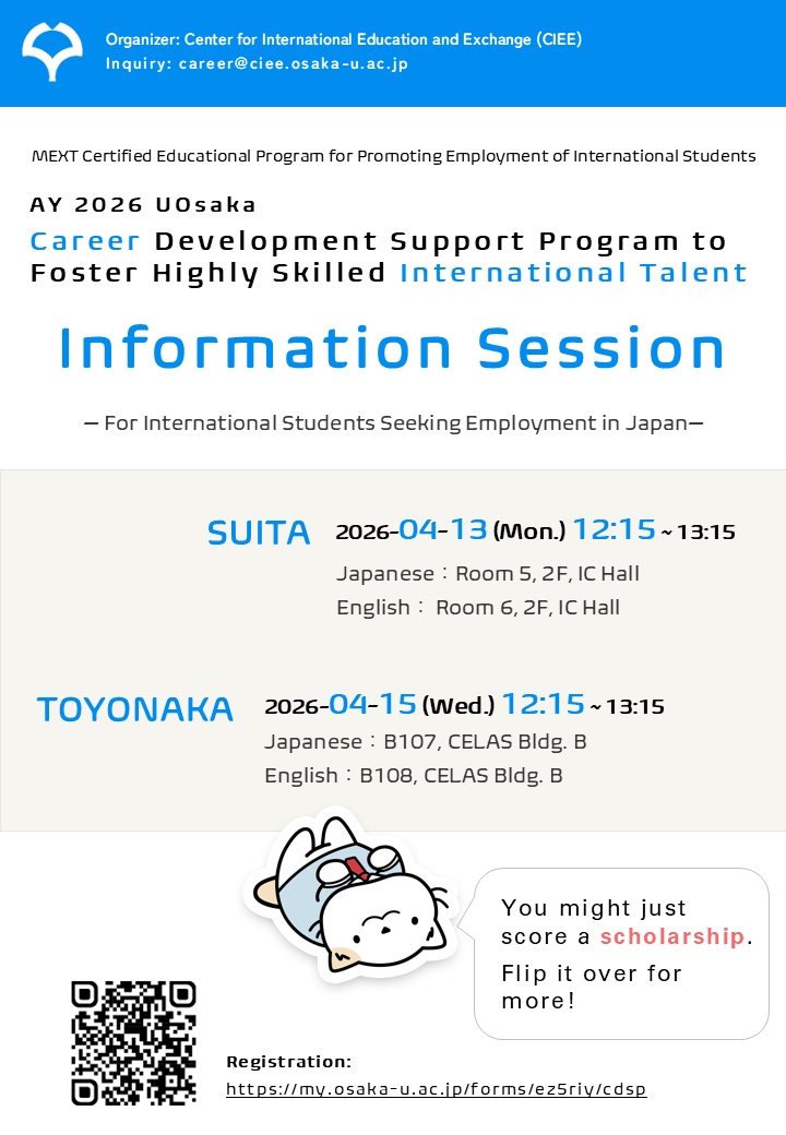 | Toyonaka | 2026-04-15 (Wed.) 12:15 ~ 13:15 | Japanese:B107, CELAS Bldg. B English:B108, CELAS Bldg. |