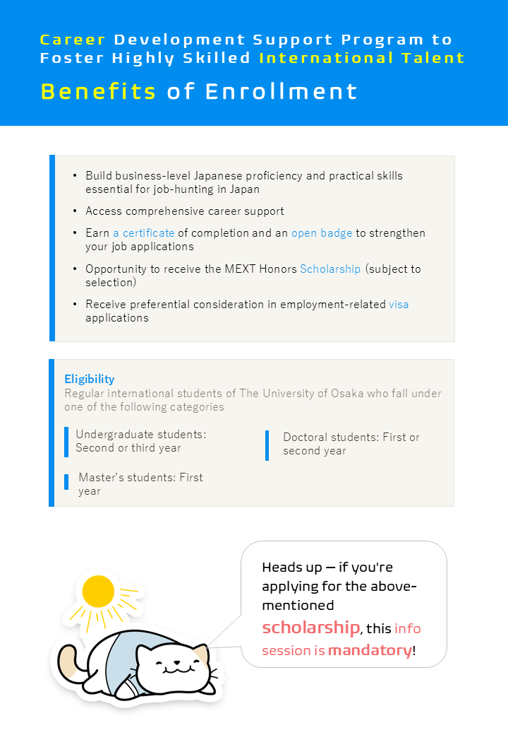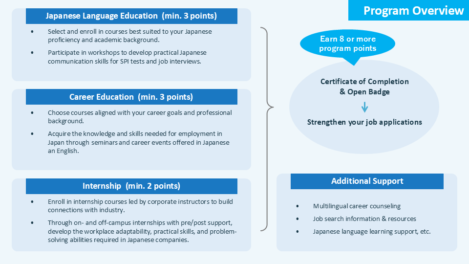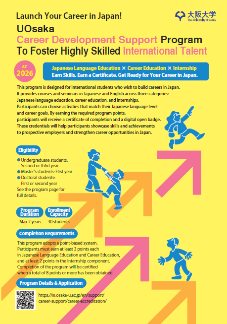 This program is designed for international students who wish to build careers in Japan. It provides courses and seminars in Japanese and English across three categories: Japanese language education, career education, and internships. Participants can choose activities that match their Japanese language level and career goals. By earning the required program points, participants will receive a certificate of completion and a digital open badge from The University of Osaka. These credentials will help participants showcase skills and achievements to prospective employers and strengthen career opportunities in Japan.