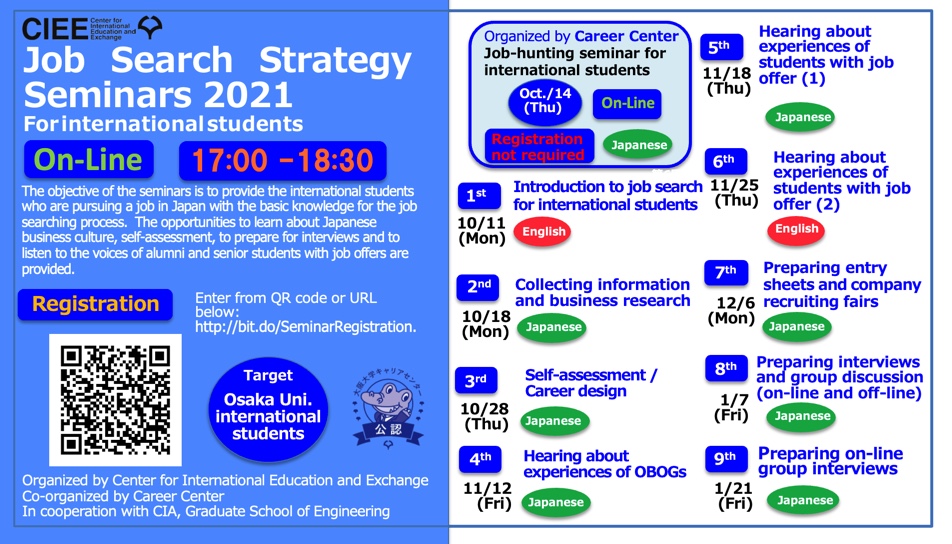 May 31st (Mon.), 2021, 17:00 – 18:30 , English Job Search Seminar for International Students (Online Introductory Course ) was held by CIEE. The number of participants were 50 international students and one researcher at Osaka University. It was a good opportunity to learn about a job hunting system in Japan.