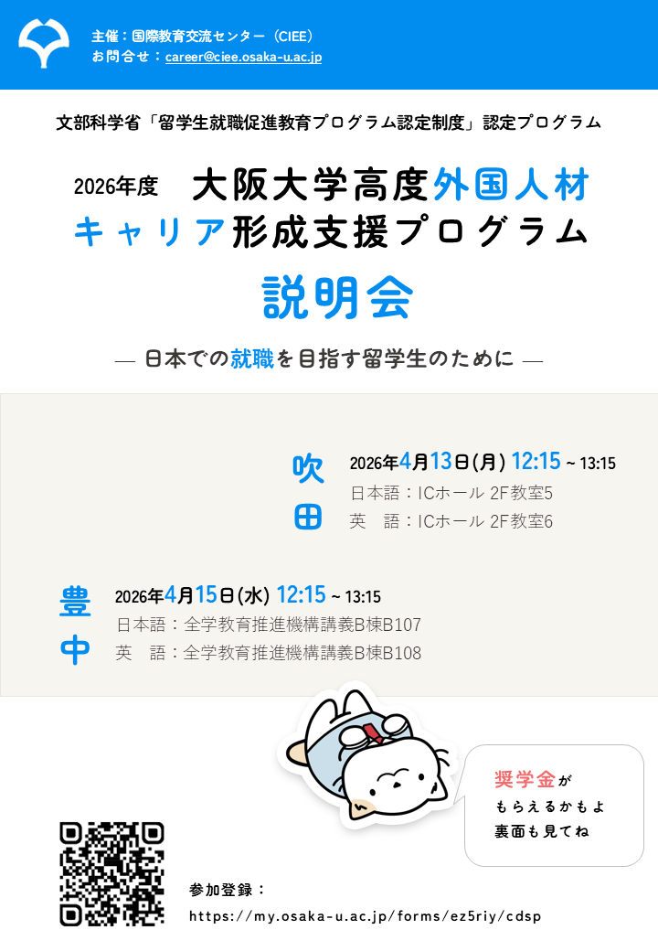 | 豊中キャンパス | 2026年4月15日(水) 12:15 ~ 13:15 | 日本語:全学教育推進機構講義B棟B107 英 語:全学教育推進機構講義B棟B108 |