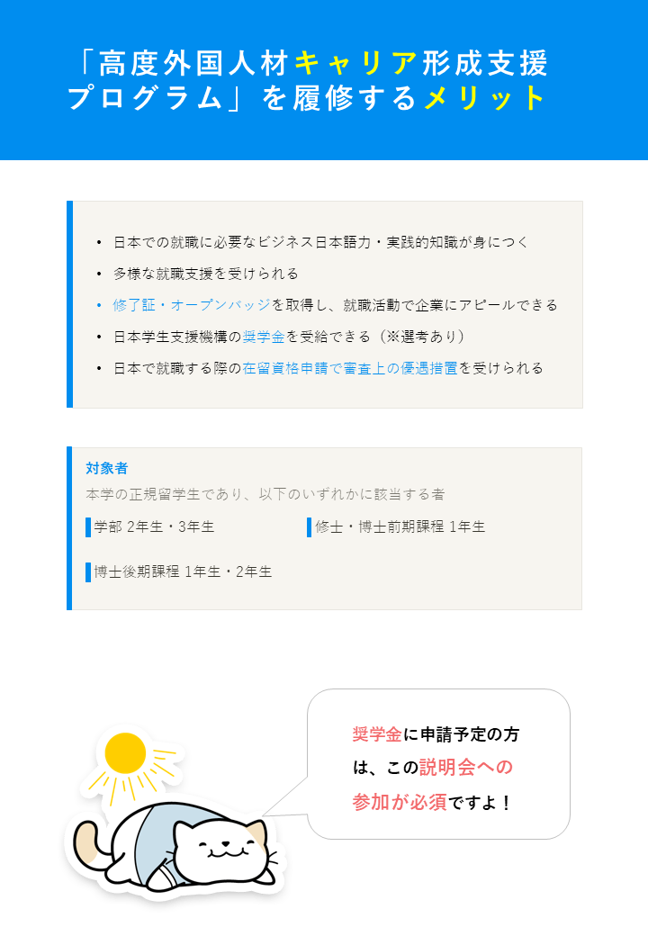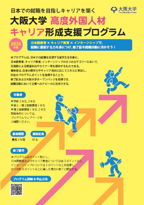 「大阪大学高度外国人材キャリア形成支援プログラム」は、日本での就職を志望する留学生を対象に、日本語教育、キャリア教育、インターンシップの三つのカテゴリーにおいて、 日英語による関連科目やセミナー等を提供するものである。