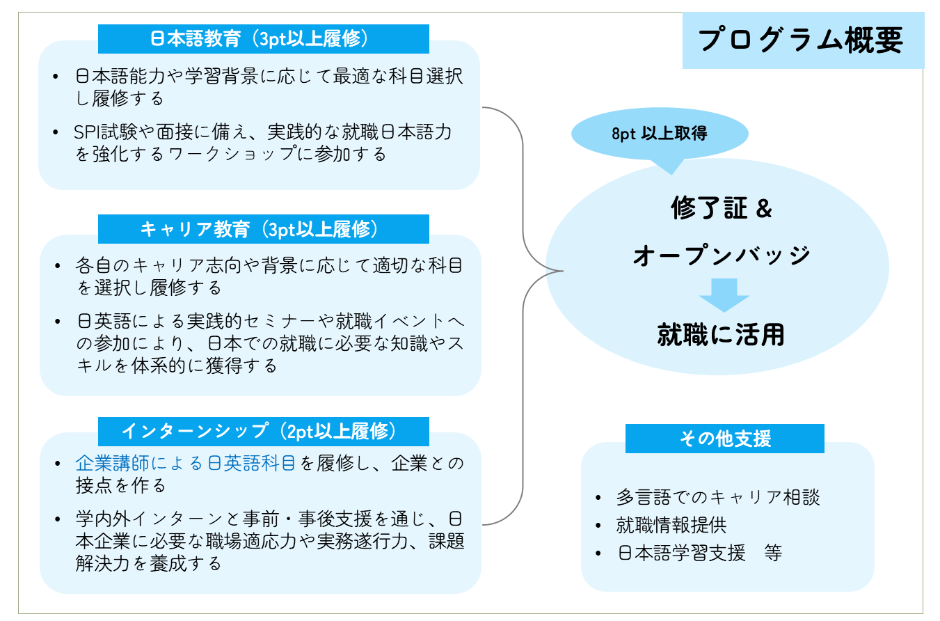 本プログラムはポイント制とし、日本語教育およびキャリア教育については各3ポイント以上、インターンシップについては2ポイント以上を取得し、かつ合計8ポイント以上に達した場合に修了と認定する。